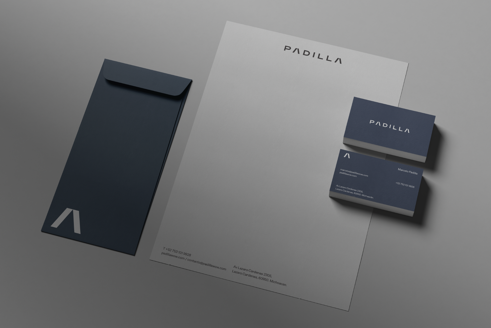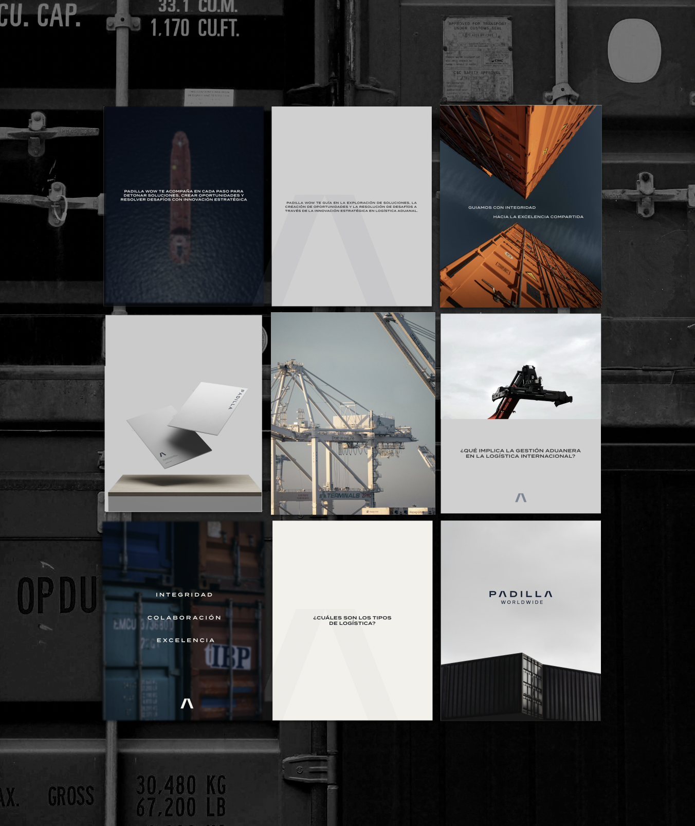 Brand identity developed for Padilla Worldwide, a logistics company focused on international trade and cargo operations. The visual system is built around structure, precision, and reliability, taking inspiration from port infrastructure, industrial materials, and modular geometry.