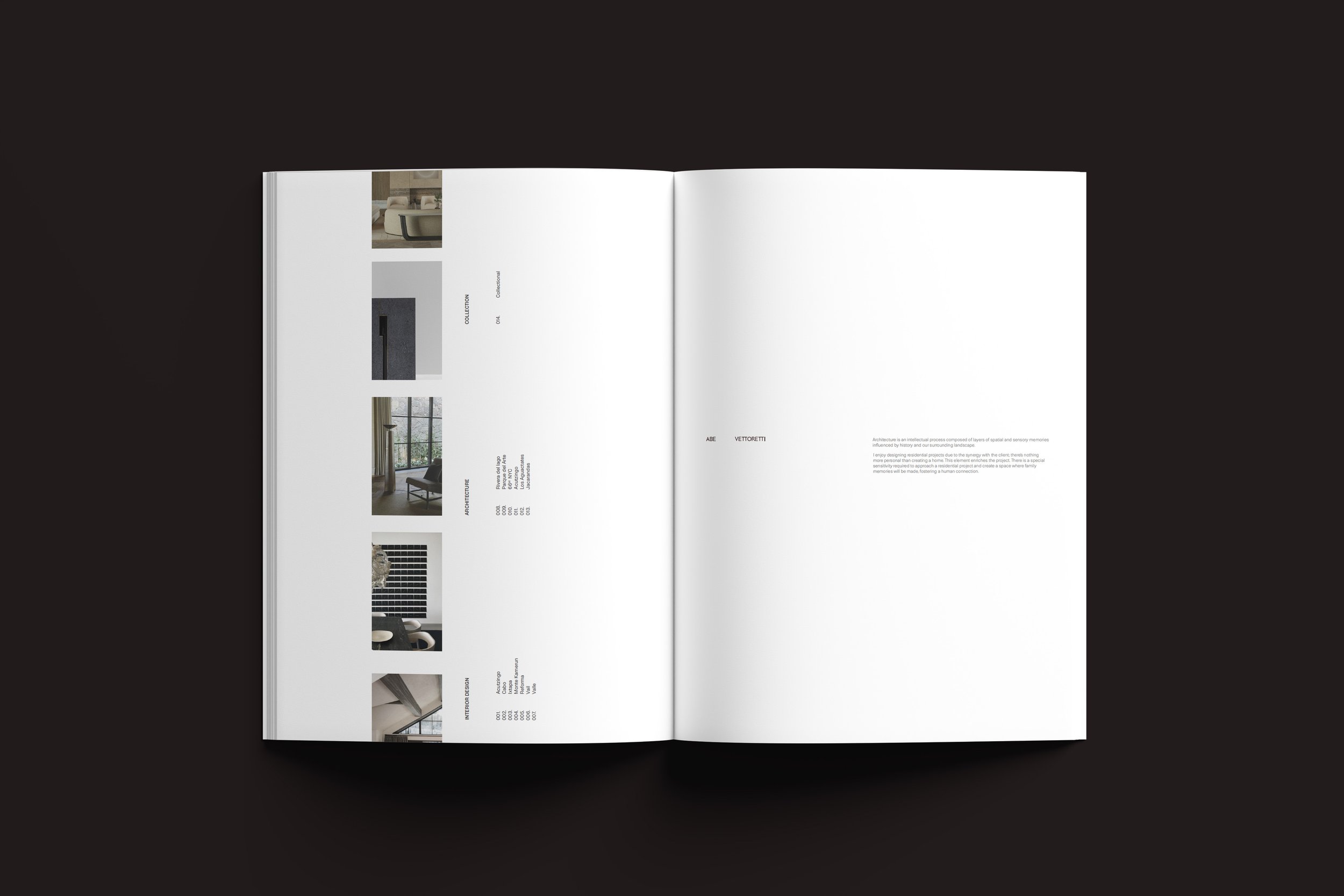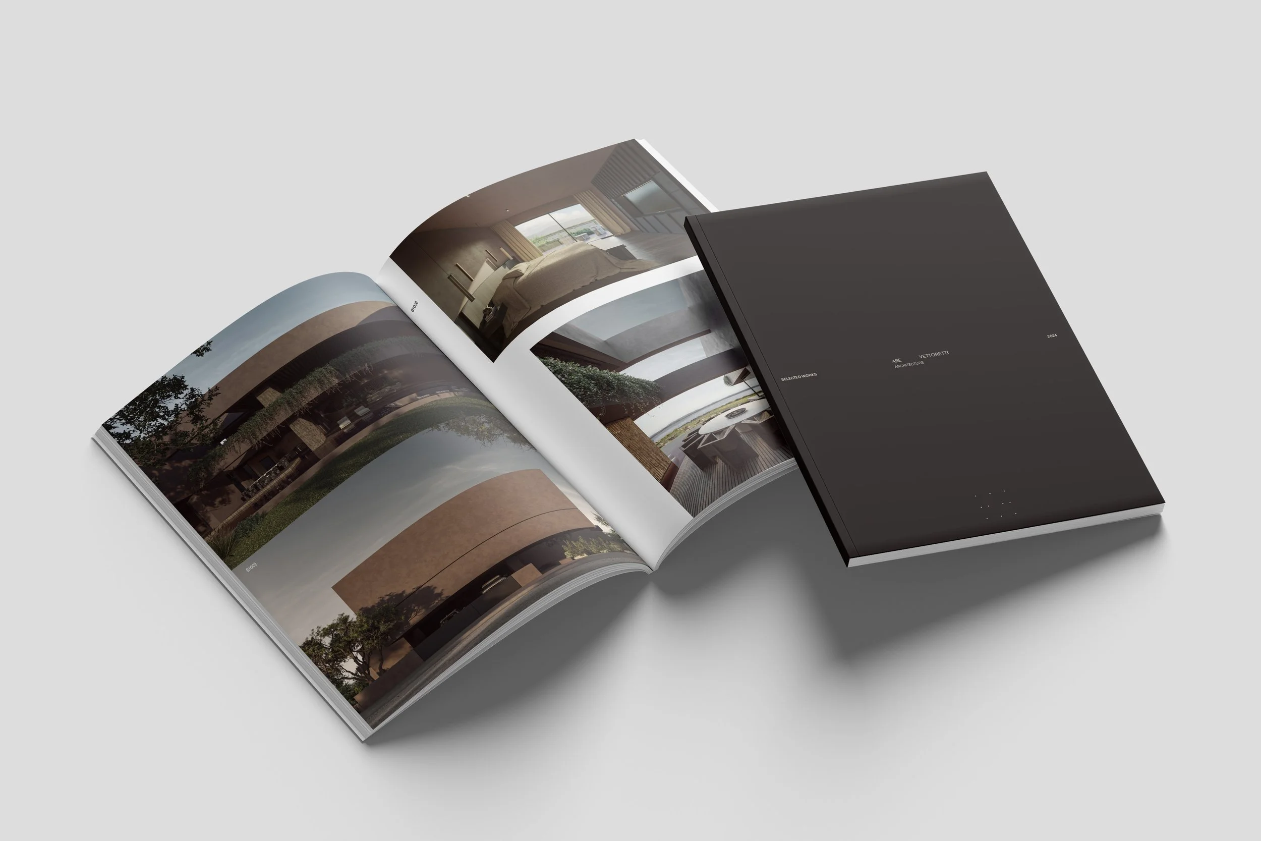 Editorial design for the architectural portfolio of AV Vettoretti, conceived as a quiet and structured publication to present spatial work with clarity and precision. The layout balances photography, drawings, and text through generous margins and restrained typography.