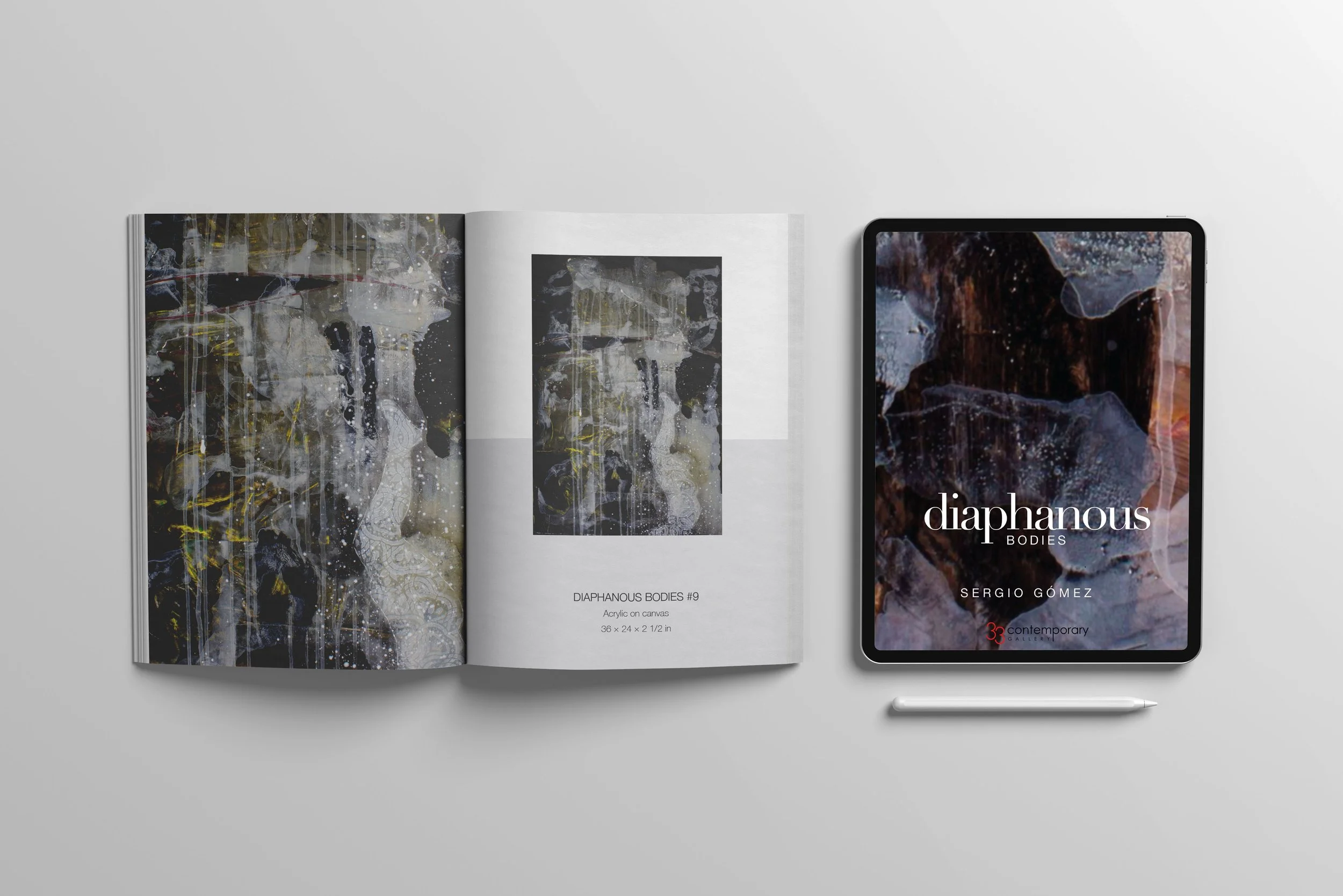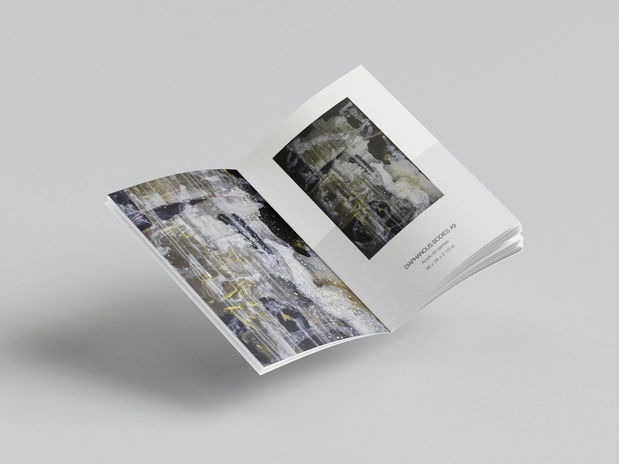 Editorial design for an exhibition catalogue developed for 33 Contemporary Gallery in Chicago. The publication was conceived as a visual extension of the artwork, allowing color, texture, and composition to guide the reading experience.