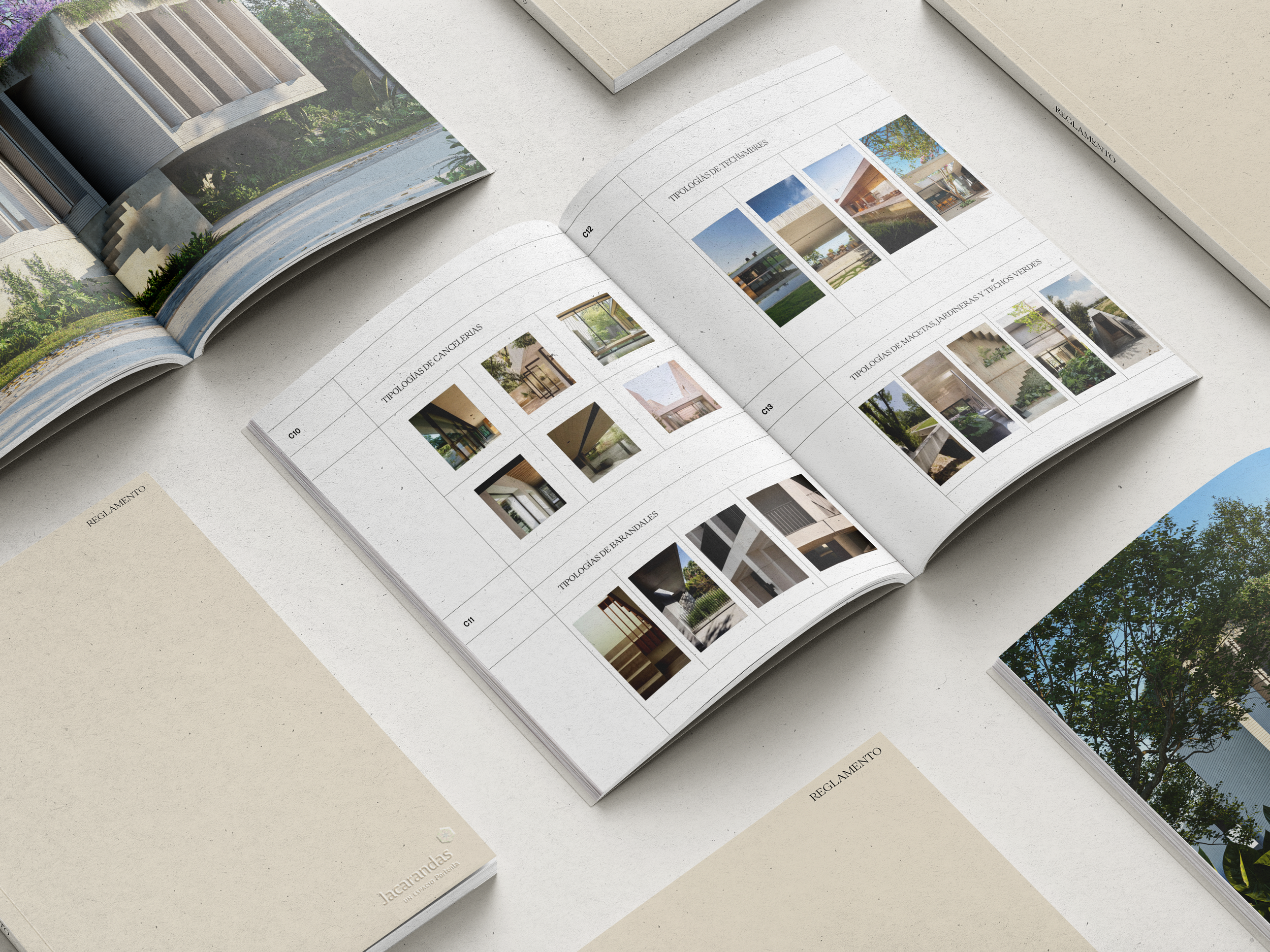 Editorial design for a residential catalogue developed to present the Jacarandas Cuernavaca project through architecture, landscape, and spatial detail. The publication uses a structured grid, restrained typography, and generous white space to organize photography, plans, and project information.